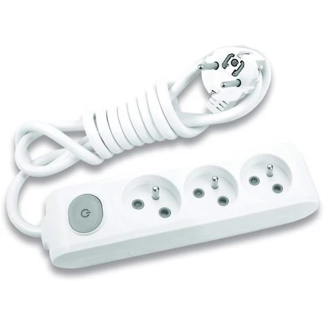 Multiprise NF pour 3 prises 2P+T. Avec sécurité enfant, bouton rétro-éclairé on/off, et support de fixation.