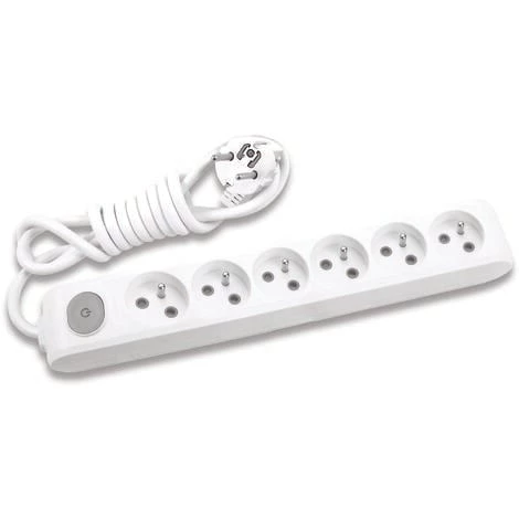 Multiprise NF pour 6 prises 2P+T. Avec sécurité enfant, bouton rétro-éclairé on/off, et support de fixation.