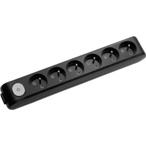 Multiprise NF pour 6 prises 2P+T. Avec sécurité enfant, bouton rétro-éclairé on/off, et support de fixation.