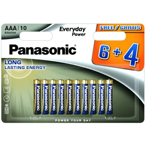 Lot de 10 piles Alkaline AAA LR03 Panasonic Everyday Power.Piles pour une utilisation de tous vos appareils du quotidienExcellente longévitéDélivre une puissance homogène tout au long de l’utilisationConception haute qualité limitant la perte d’énergie en cas de stockage prolongéUtilisations possibles : Horloge, balance, radio, baby-phone, télécommande, etc…Type : AAA / LR03Voltage : 1,5VSous-marque : Everyday power