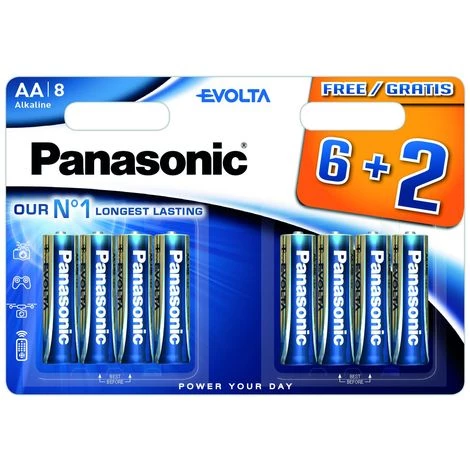 Lot de 8 piles Alkaline AA LR06 Panasonic EvoltaPiles premium haute performanceExcellente longévitéDélivre une puissance homogène tout au long de l’utilisationConception haute qualité limitant la perte d’énergie en cas de stockage prolongéIdéal pour les appareils énergivoresUtilisations possibles : Appareils photos, manettes de jeu, drones, télécommandes, etc…Type : AA / LR6Voltage : 1,5VSous-marque : Evolta