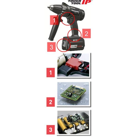 Même pendant les charges de travaux élevées, le moteur « 4-charbons » maintient la puissance sans perdre de la vitesse. Et cela en fournissant un fonctionnement continu. Le concept « Touch Tool IP » inclut des fonctionnalités telles que des capteurs qui surveillent les batteries. De plus il les protègent contre la surchauffe et les surcharges. Cette technologie assure un fonctionnement fiable, sûr et puissant pour l’utilisateur. 1: Interrupteur Augmentation de l’étanchéité pour une meilleure protection contre l’eau et la poussière. 2: Electronique Les circuits électroniques dans le panneau de commande et dans la batterie sont recouverts d’une couche d’uréthane pour garantir une protection accrue contre la poussière et l’eau. 3: Batterie Les cellules des batteries sont conçues pour éviter l’intrusion d’humidité. La perceuse visseuse sans fil PANASONIC 18V 5.0Ah Li-ion offre également 18 niveaux de couples + positions de perçages, un mandrin de serrage de 13mm (sans clé), un contrôle de vitesse électrique, un frein électrique, une lumière LED. Elle est vendue avec 2 batteries EY9L45B, un chargeur EY0L82B et une mallette de transport compact en polycarbonate. La gamme d’outils électroportatifs professionnels PANASONIC comporte :